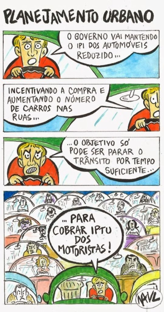 II – A tirinha ironiza os congestionamentos de trânsito e traça uma relação com os incentivos governamentais na compra de automóveis, algo que promove inchamento do tráfego.